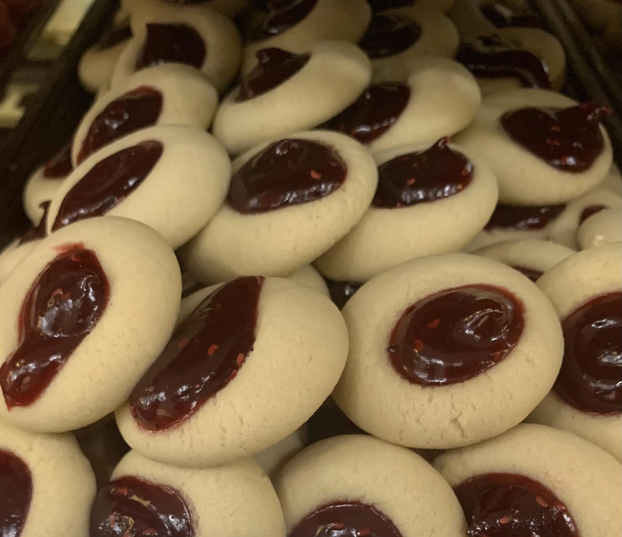 2 Butter Cookies Filled with Raspberry Filling Drizzled with Chocolate.