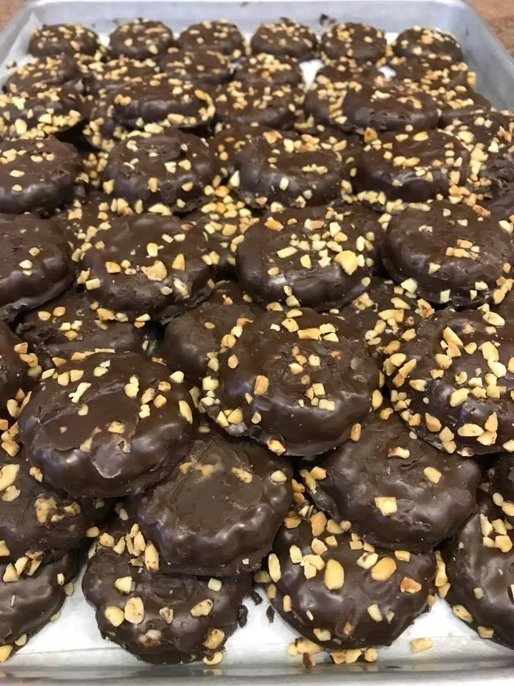 Shortbread with Peanut Butter in Center Coated with Chocolate and Peanuts .